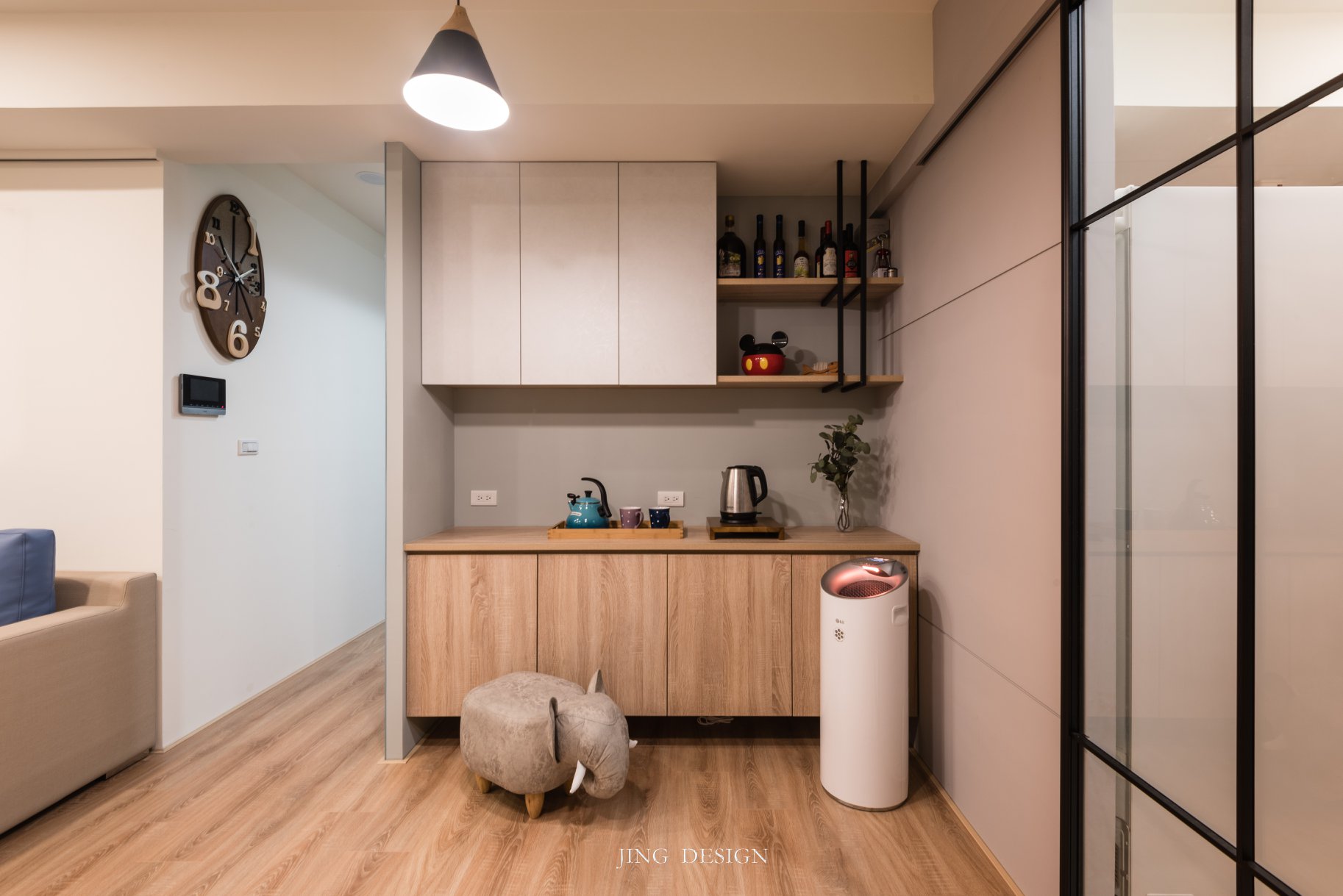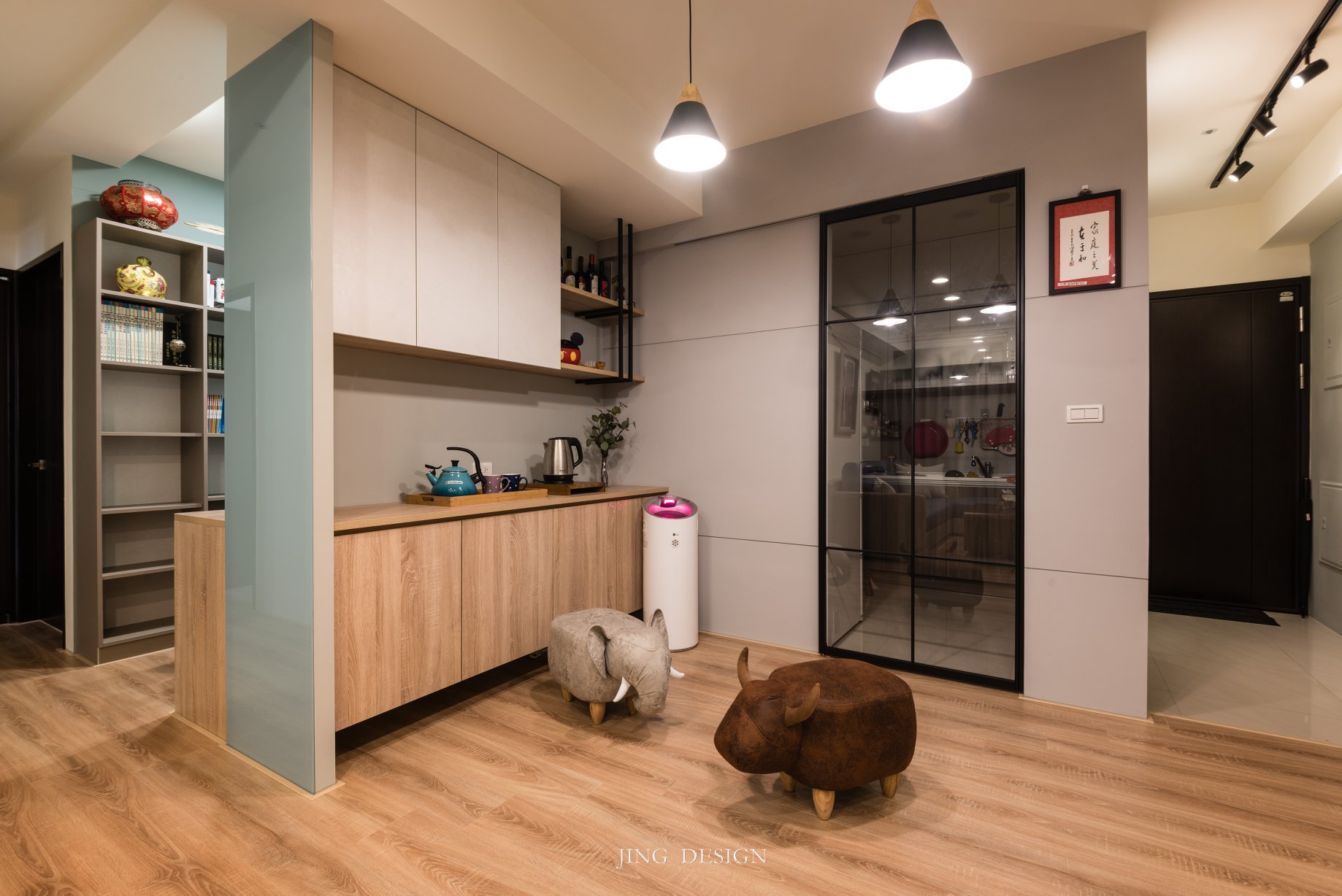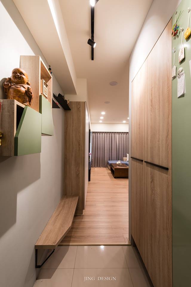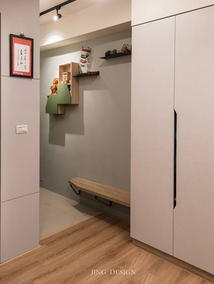 空間採用簡約灰色調搭接溫潤木質,導入光線打亮灰色牆面與黑色櫃體,讓個性鮮明之外更顯休閒舒適,呈現優雅灰階的美,讓沈穩與實用各性質共處。玄關的小角落灰綠色調陳列,鐵板上記錄家庭的生活點滴,增添玄關的活潑與機能性,讓整體空間充滿了溫度。