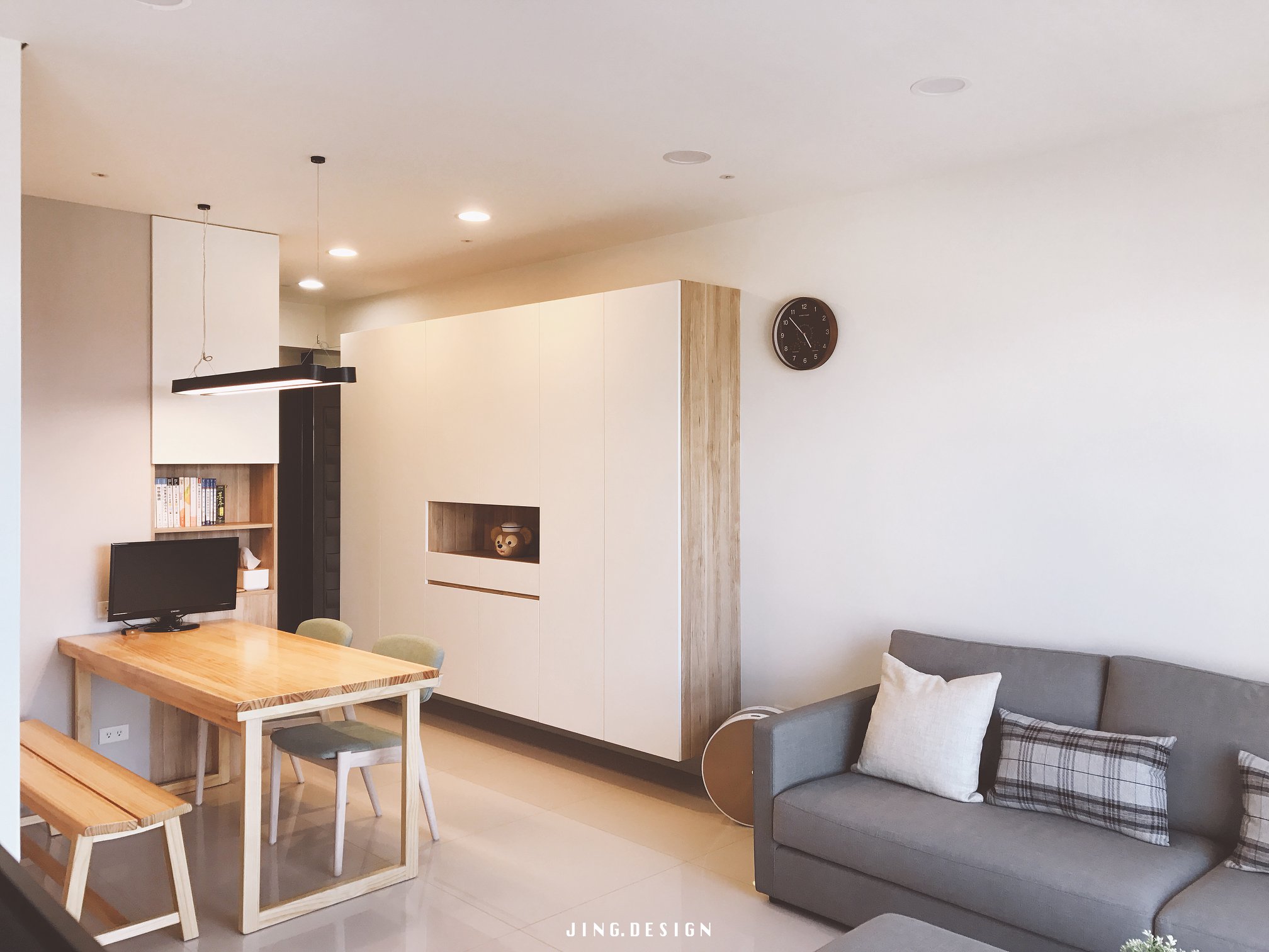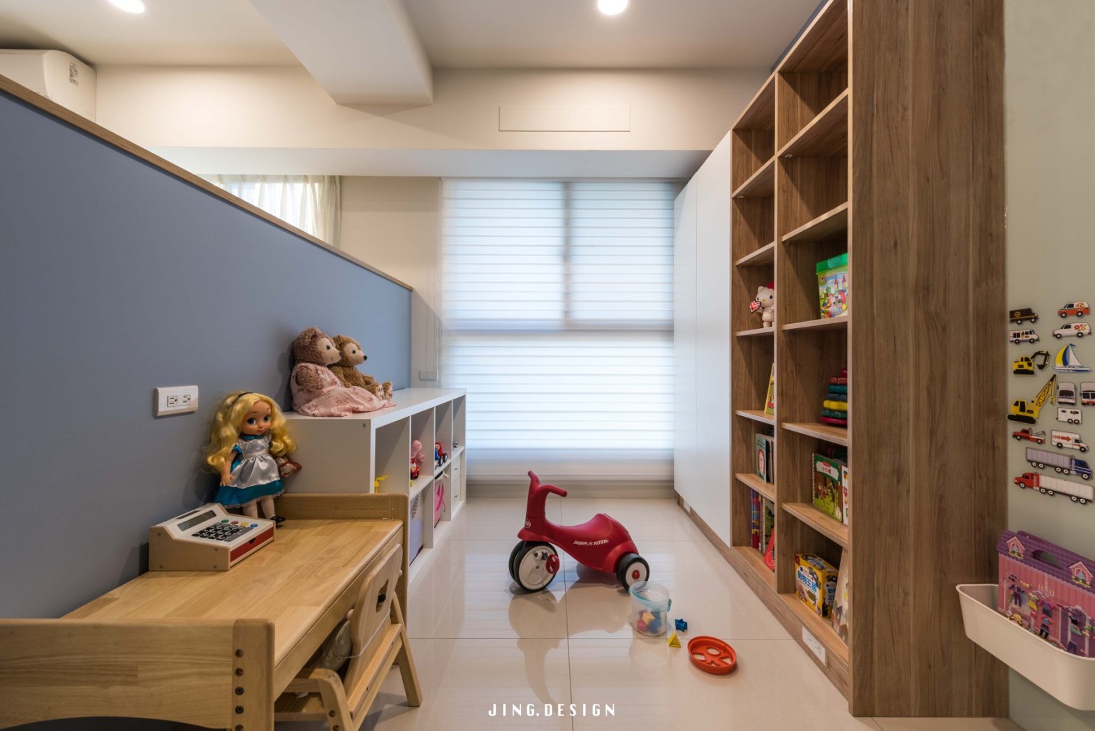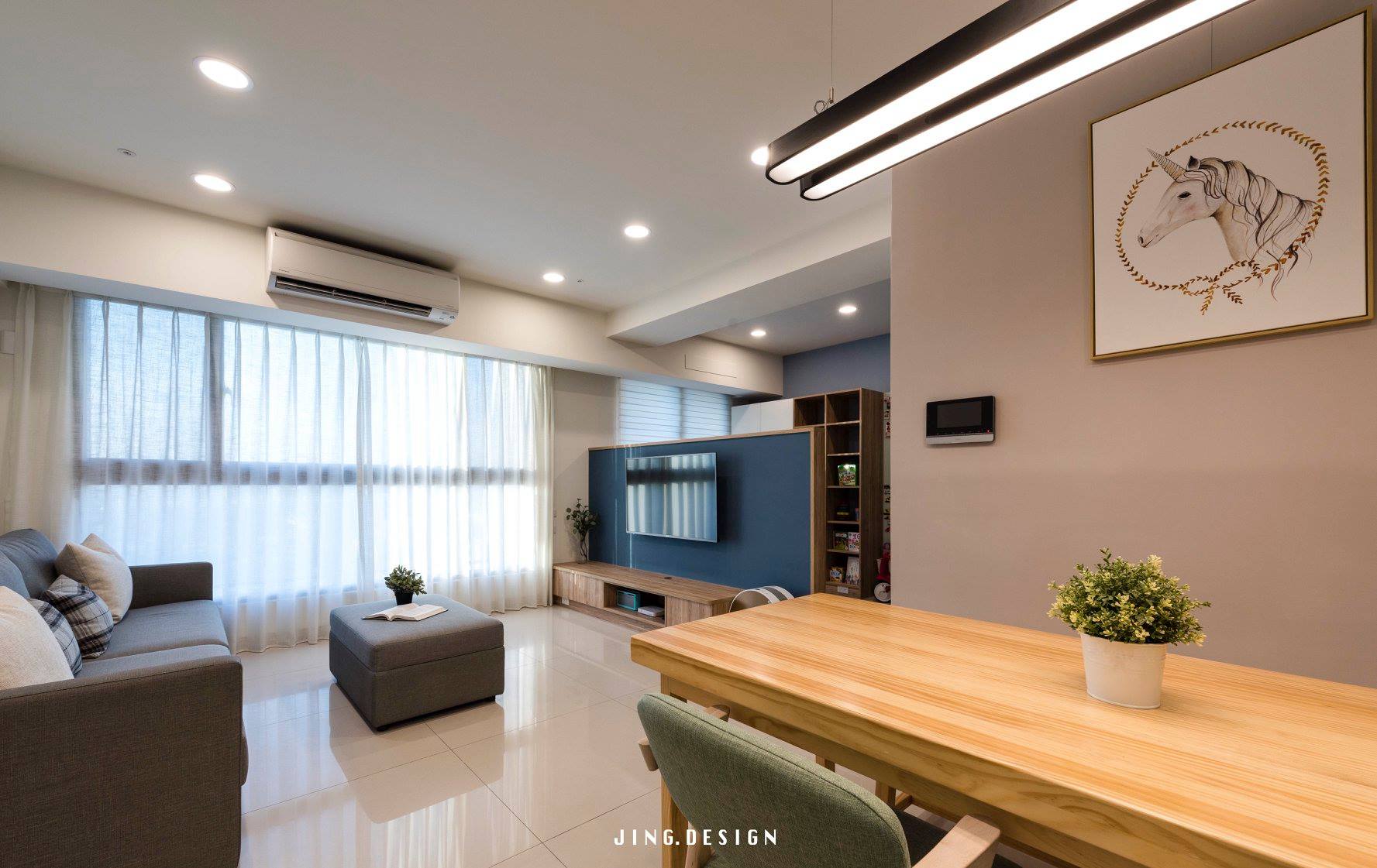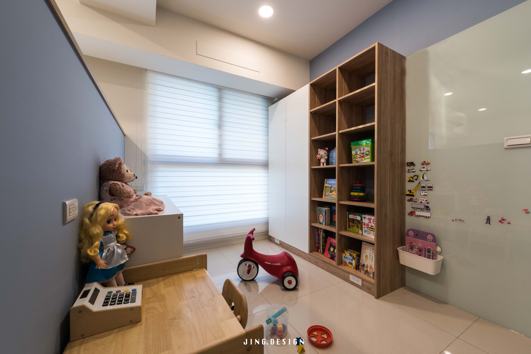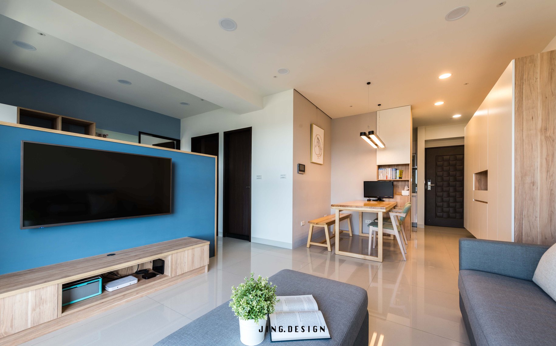 以大量純白色調渲染整體空間,並結合木元素、藍色調互相搭配交織出清爽感,打造清新舒壓的住宅。為了讓孩子快樂成長,以半高牆方式區隔一間小天地,讓孩子可在此開心玩耍,而自然光隨著網紗窗簾篩灑一地,寬敞舒適的空間感,在合理預算下營造簡約、溫暖的風格,更滿足屋主大量的收納需求,讓風格與實用度兼備。