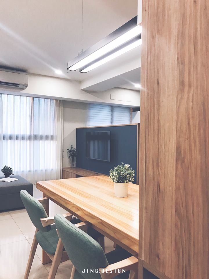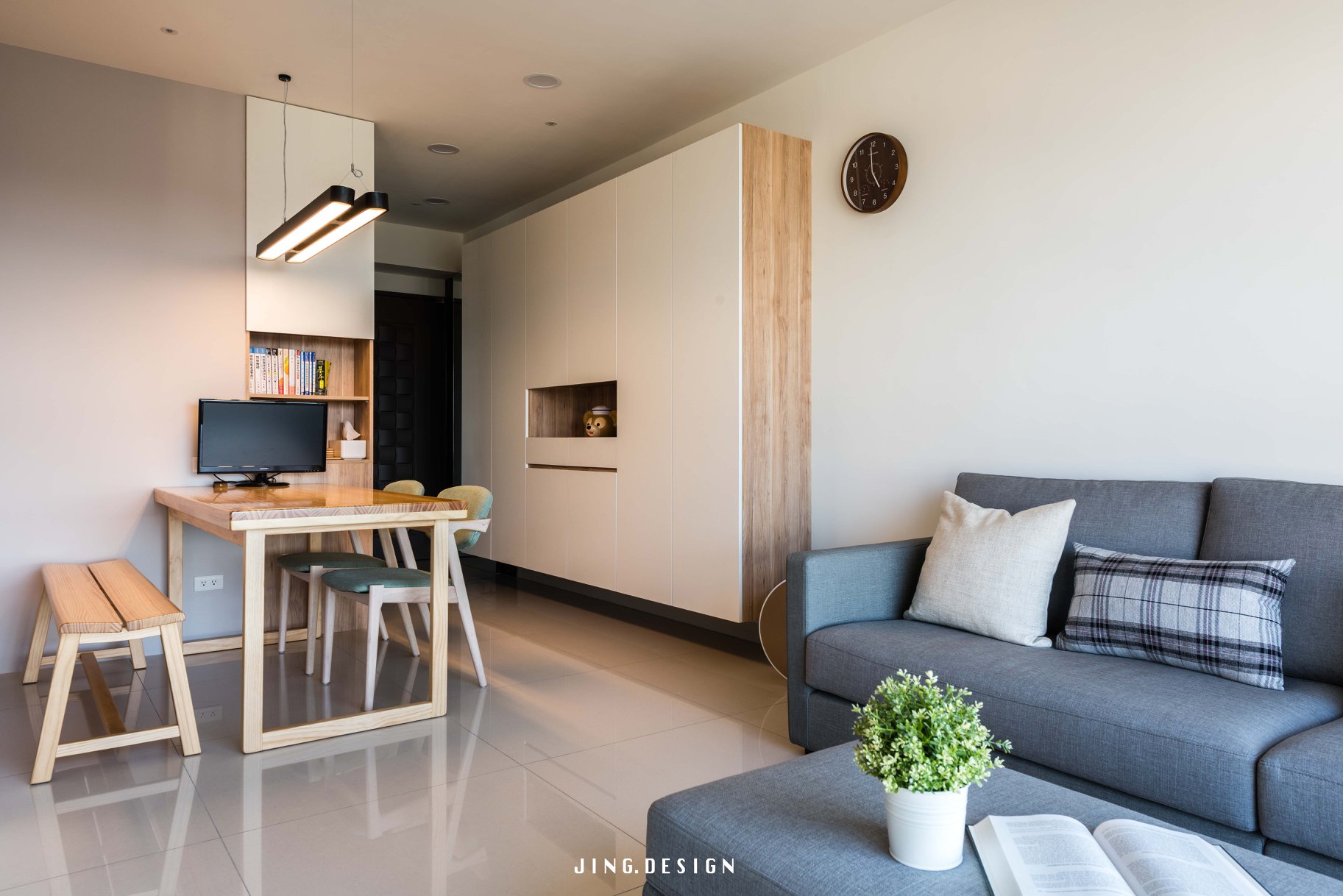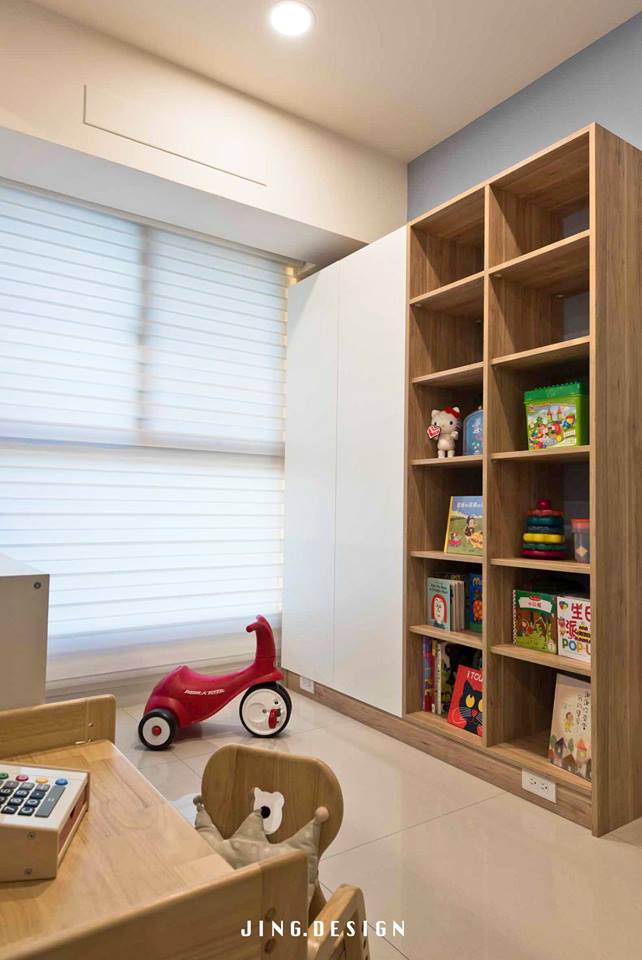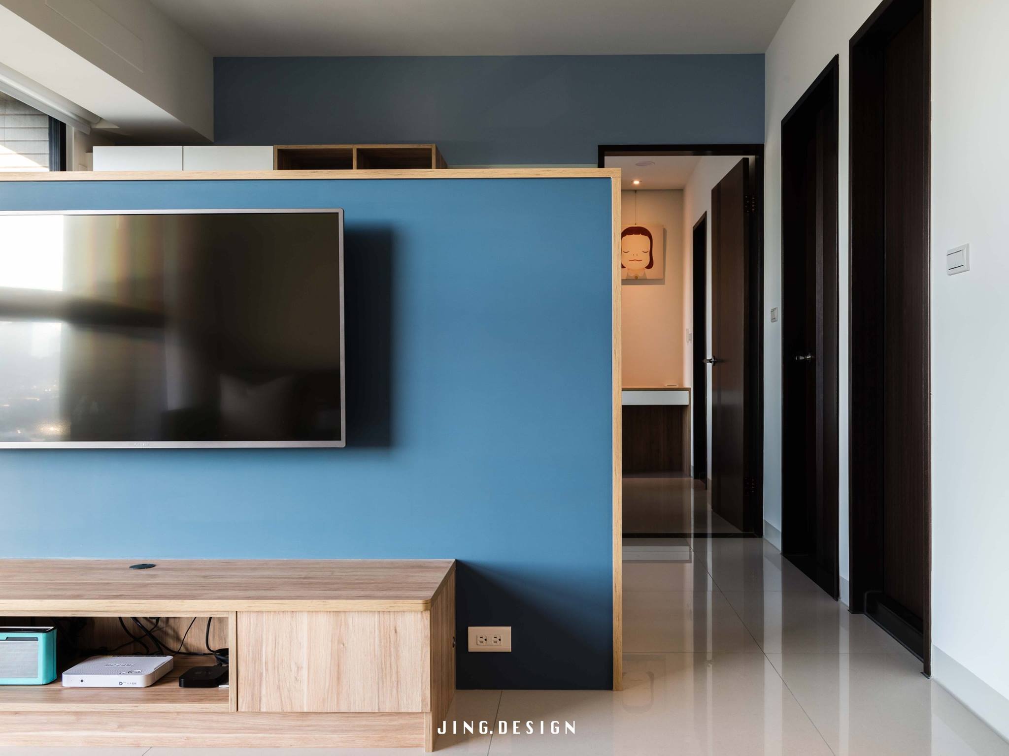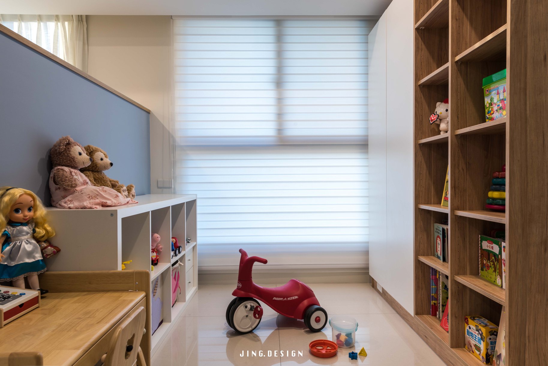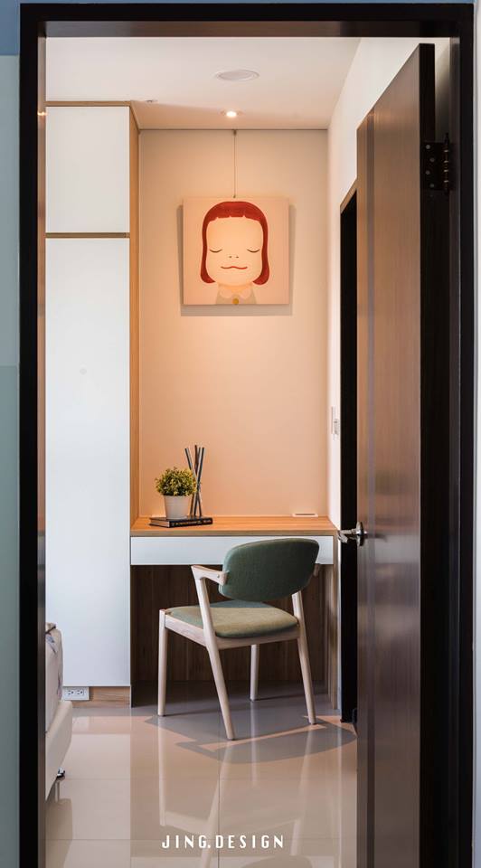 以大量純白色調渲染整體空間,並結合木元素、藍色調互相搭配交織出清爽感,打造清新舒壓的住宅。為了讓孩子快樂成長,以半高牆方式區隔一間小天地,讓孩子可在此開心玩耍,而自然光隨著網紗窗簾篩灑一地,寬敞舒適的空間感,在合理預算下營造簡約、溫暖的風格,更滿足屋主大量的收納需求,讓風格與實用度兼備。
