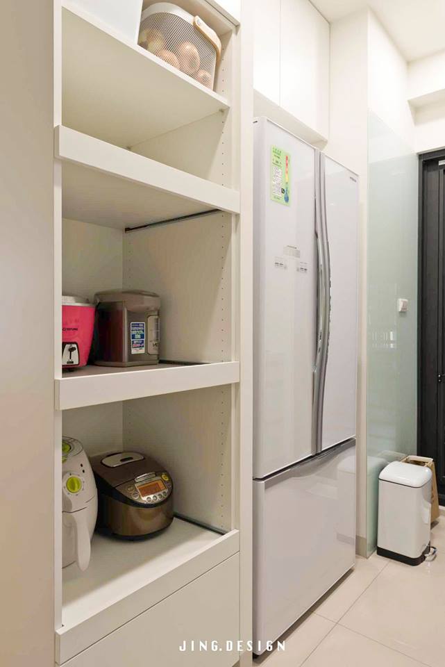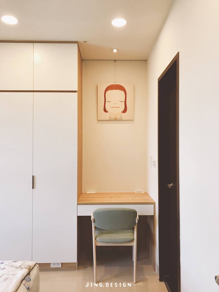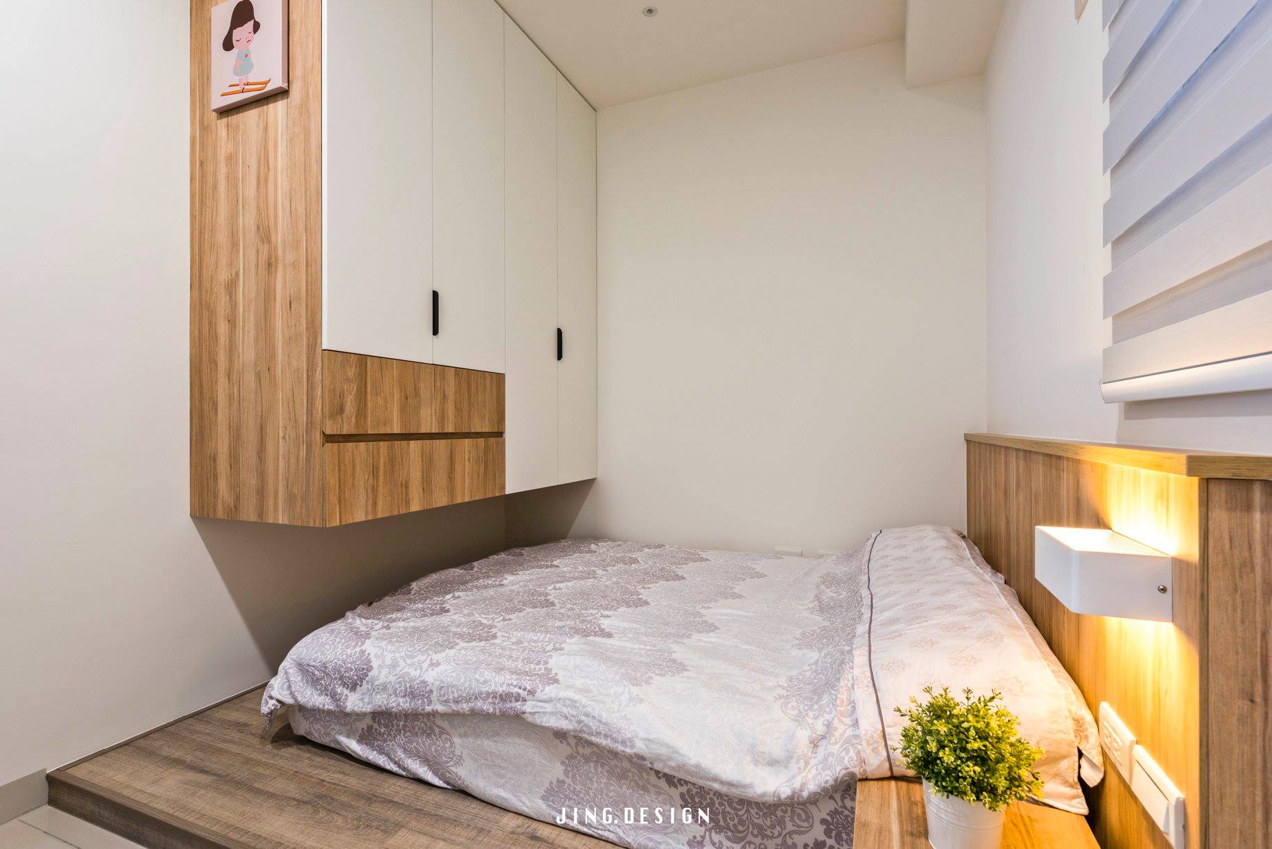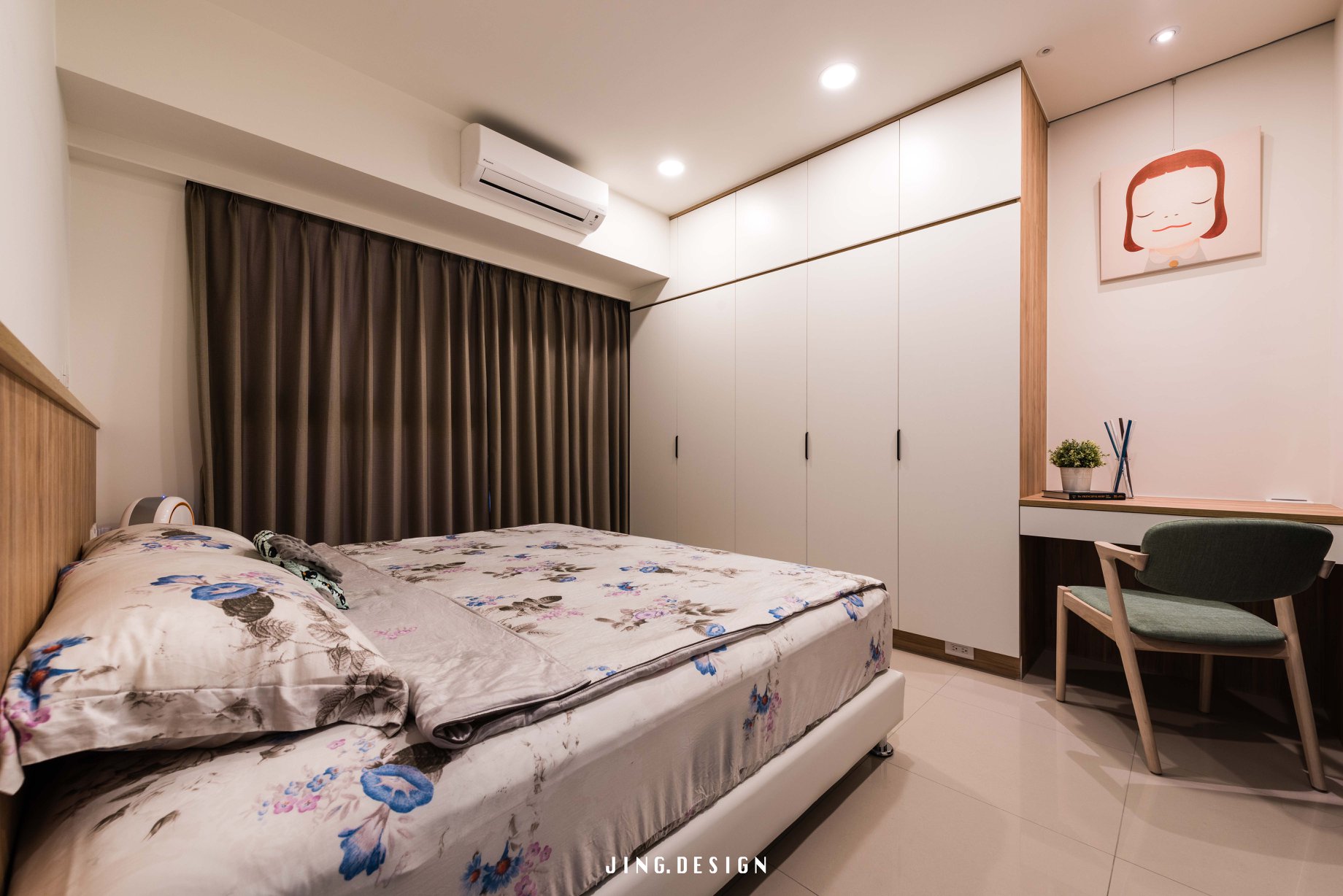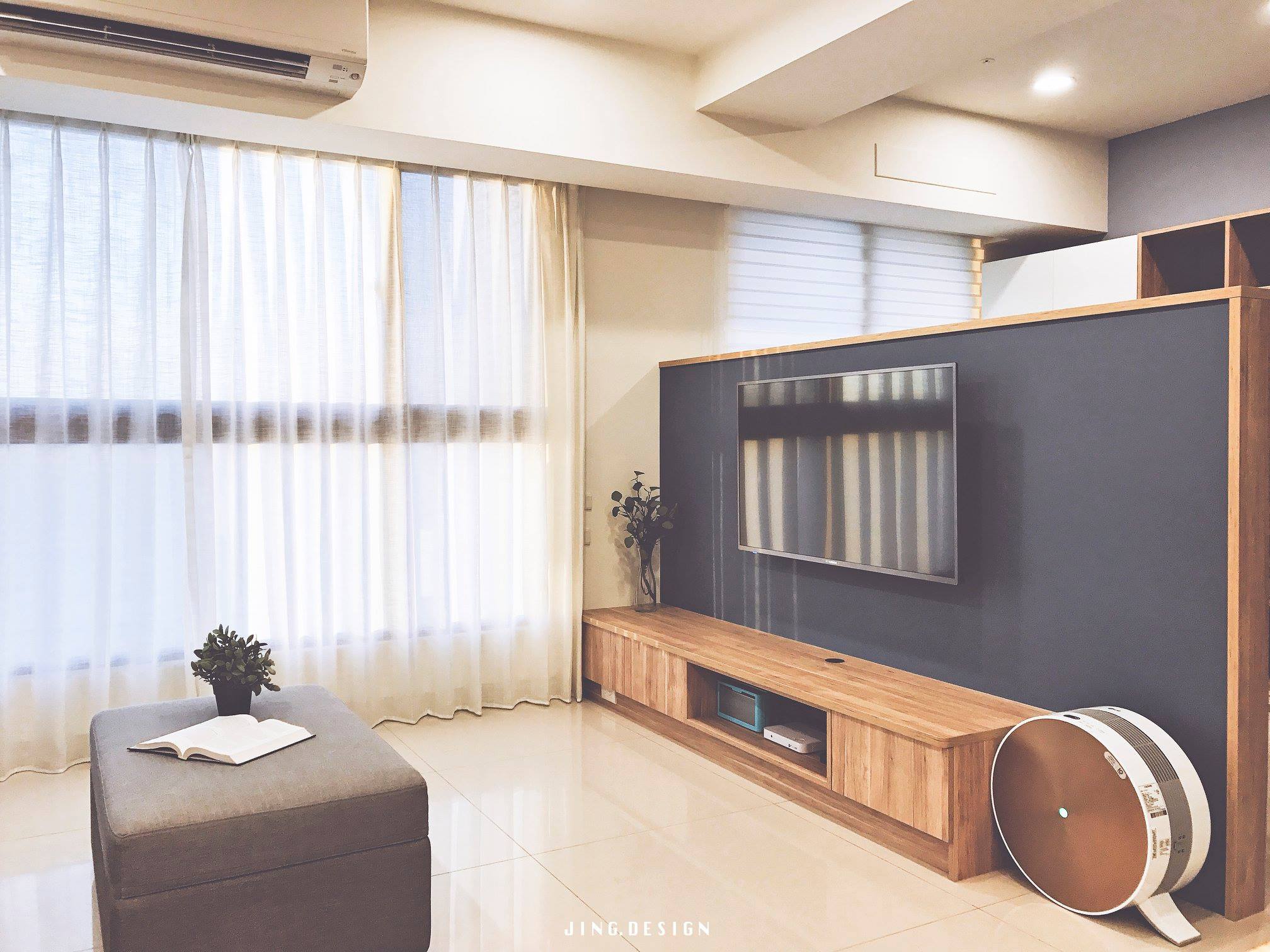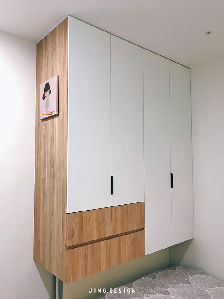 以大量純白色調渲染整體空間,並結合木元素、藍色調互相搭配交織出清爽感,打造清新舒壓的住宅。為了讓孩子快樂成長,以半高牆方式區隔一間小天地,讓孩子可在此開心玩耍,而自然光隨著網紗窗簾篩灑一地,寬敞舒適的空間感,在合理預算下營造簡約、溫暖的風格,更滿足屋主大量的收納需求,讓風格與實用度兼備。